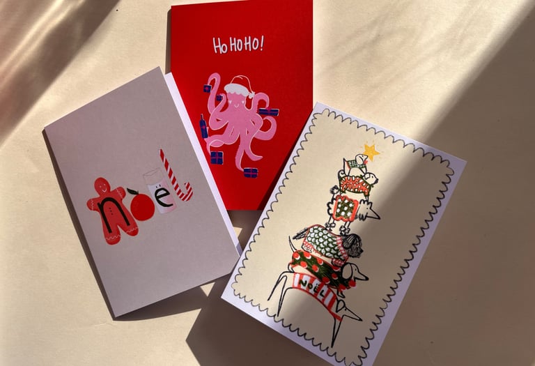 Célébrez la magie des fêtes avec les cartes de Noël illustrées par Beeb, originales, pleines de tendresse et de bonne humeur.